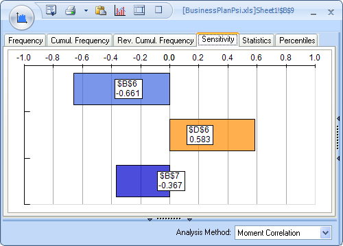 By clicking the Sensitivity tab, you can view a Tornado chart that shows you, at a glance, which uncertain variables have the greatest impact -- positive or negative -- on the value of this uncertain function.  You can compute the sensitivity via either Moment Correlation or Rank Correlation.