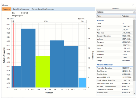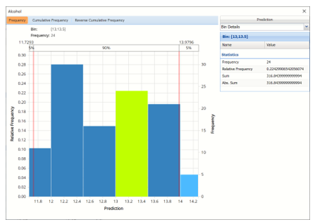 Bin: If viewing the chart with only the Predicted or simulate data, only one grid will be displayed on the Bin Details pane. This grid displays important bin statistics such as frequency, relative frequency, sum and absolute sum.