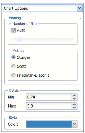 • Method: Three generators are included in the Analyze Data application to generate the “optimal” number of bins displayed in the chart. All three generators implicitly assume a normal distribution.  Sturges is the default setting. The Scott generator should be used with random samples of normally distributed data. The Freedman-Diaconis’ generator is less sensitive than the standard deviation to outliers in the data.