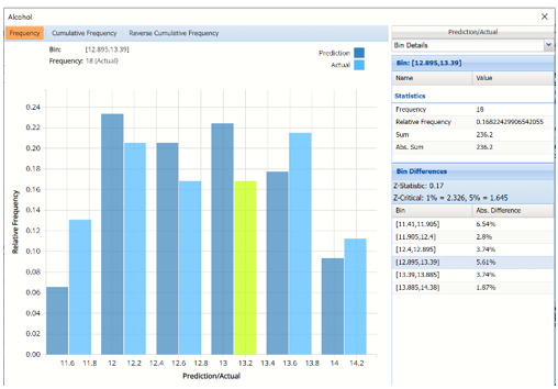 Notice that red lines which connect the relative Bin Differences for each bin.  Bin Differences are computed based on the frequencies of records which predictions fall into each bin.  For example, consider the highlighted bin in the screenshot above [x0, x1] = [13.0706, 13.2718].  There are 10 Simulation records and 11 Training records in this bin.  The relative frequency of the Simulation data is 10/100 = 10% and the relative frequency of the Training data is 11/107 = 10.28%.  Hence the Absolute Difference (in frequencies) is = |10 – 10.3| = .28%.