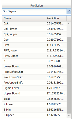 Notice in the screenshot below that both the Prediction and Actual data appear in the chart together, and statistics, percentiles or Six Sigma indices for both data appear on the right.
