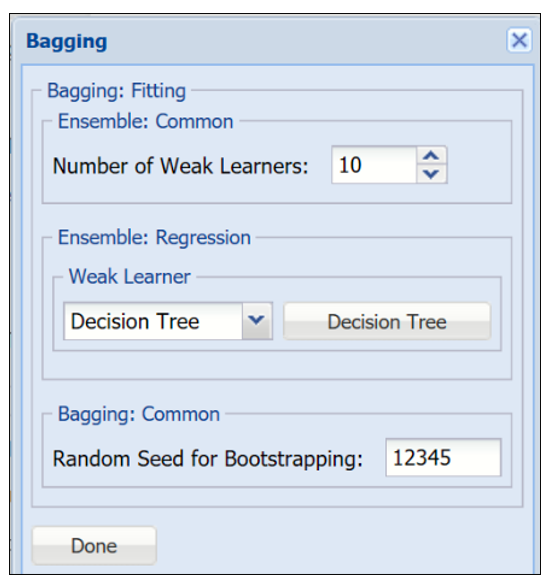 Weak Learner Under Ensemble: Common click the down arrow beneath Weak Leaner to select one of the four featured classifiers:  Linear Regression, k-NN, Neural Networks or Decision Tree.  The command button to the right will be enabled.  Click this command button to control various option settings for the weak leaner.