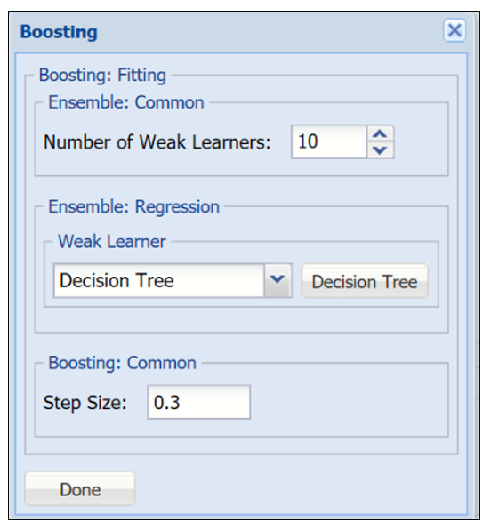 Number of Weak Learners This option controls the number of "weak" regression models that will be created.  The ensemble method will stop when the number of regression models created reaches the value set for this option.  The algorithm will then compute the weighted sum of votes for each class and assign the “winning” value to each record.