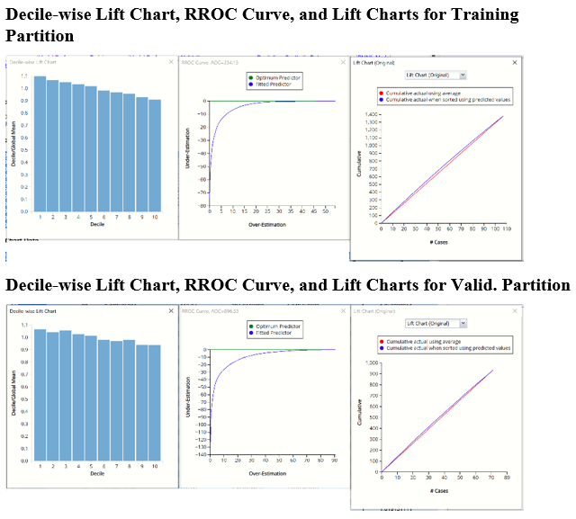 The decile-wise lift curve is drawn as the decile number versus the cumulative actual output variable value divided by the decile's mean output variable value.  This bars in this chart indicate the factor by which the Linear Regression model outperforms a random assignment, one decile at a time.  Typically, this graph will have a "stairstep" appearance - the bars will descend in order from left to right as shown in the decile-wise charts for both partitions.
