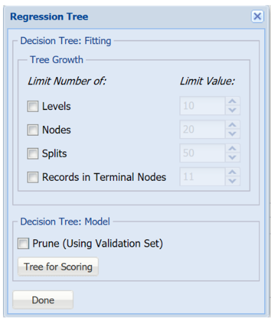 Tree Growth Levels, Nodes, Splits, Tree Records in Terminal Nodes In the Tree Growth section, select Levels, Nodes, Splits and Records in Terminal Nodes.  Values entered for these options limit tree growth, i.e. if 10 is entered for Levels, the tree will be limited to 10 levels.