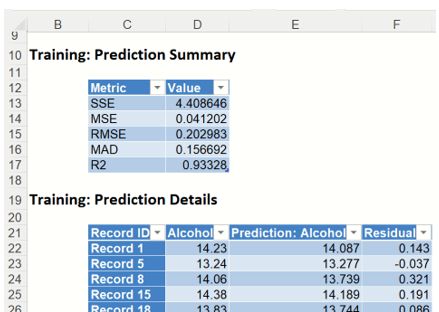 The Prediction Summary for the Training Partition lists the following metrics:  SSE, MSE, RMSE, MAD and R2.  See definitions above.