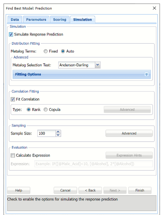 All supervised algorithms include a new Simulation tab.  This tab uses the functionality from the Generate Data feature (described in the What’s New section of this guide and then more in depth in the Analytic Solver Data Science Reference Guide) to generate synthetic data based on the training partition, and uses the fitted model to produce predictions for the synthetic data.  The resulting report, PFBM_Simulation, will contain the synthetic data, the predicted values and the Excel-calculated Expression column, if present.  In addition, frequency charts containing the Predicted, Training, and Expression (if present) sources or a combination of any pair may be viewed, if the charts are of the same type.  Since this new functionality does not support categorical variables, these types of variables will not be present in the model, only continuous variables.