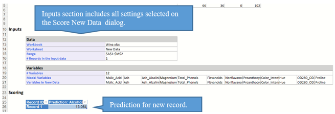 Click OK to score the new data record and predict the alcohol content of the new wine sample.