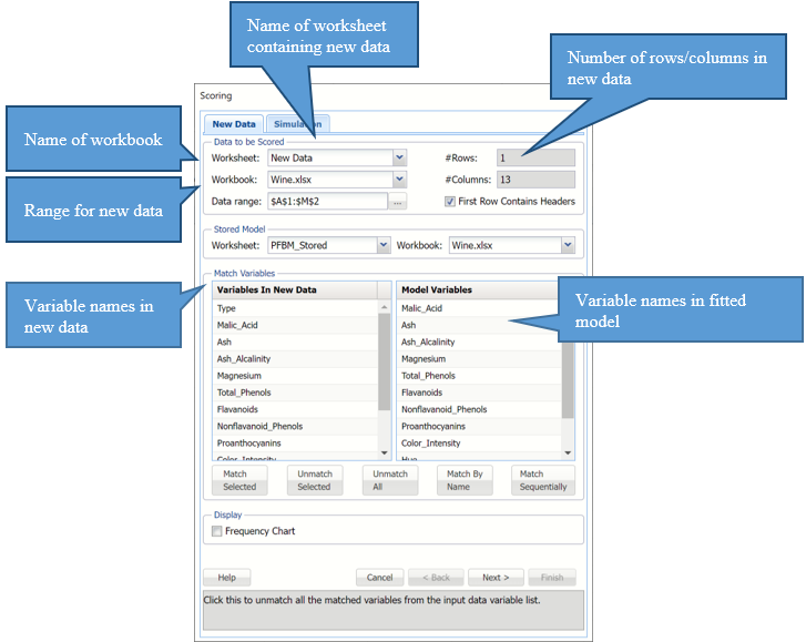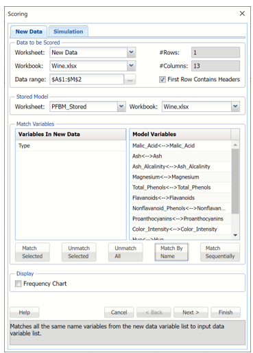 Click "Match By Name" to match each variable in the new data with the same variable in the fitted model, i.e. Malic_Acid with Malic_Acid, Ash with Ash, etc.