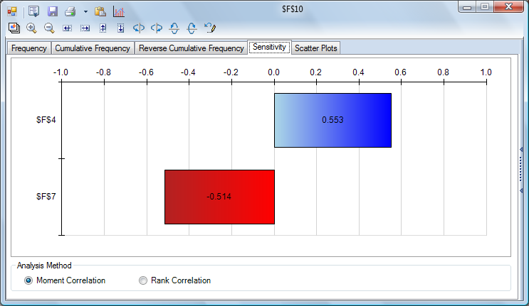 The Sensitivity tab in the Uncertain Function displays a Tornado chart that shows you how much Net Profit (cell F10) changes with a change in the uncertain variables -- our integer uniform distribution at cell F4, and the triangular distribution for Unit Cost at cell F7. In this model there are only two uncertain variables, but in a large model with many such variables, it’s usually not obvious which ones have the greatest impact on outcomes such as Net Profit. A Tornado chart highlights the key variables, as shown below: