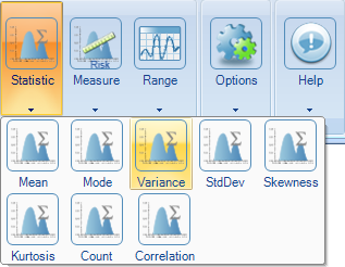 The Statistics gallery provides easy ways to compute the Mean, Mode, Variance, Standard Deviation, Skewness, and Kurtosis of an uncertain function, or the Pearson product-moment correlation coefficient between two uncertain variables or functions.  You can also obtain a Count of all Monte Carlo trials, normal trials, or error trials.