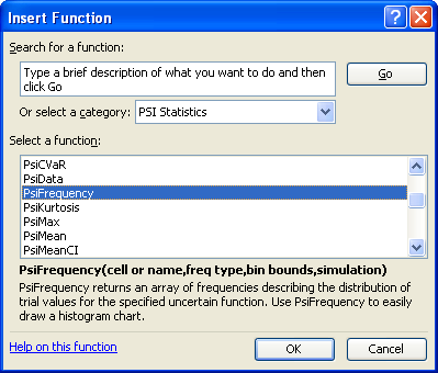 A very useful function in custom applications is PsiFrequency(), which returns the frequencies or "bin counts" for the values of an uncertain function during a simulation.  In just a few seconds with the Excel Chart Wizard, you can create a bar chart on the worksheet that reflects the same information as Risk Solver's Uncertain Function dialog Frequency chart.  You can specify the number and sizes of bins in the arguments to PsiFrequency(), and you can customize the Excel chart's colors, titles, gridlines, legends and more.