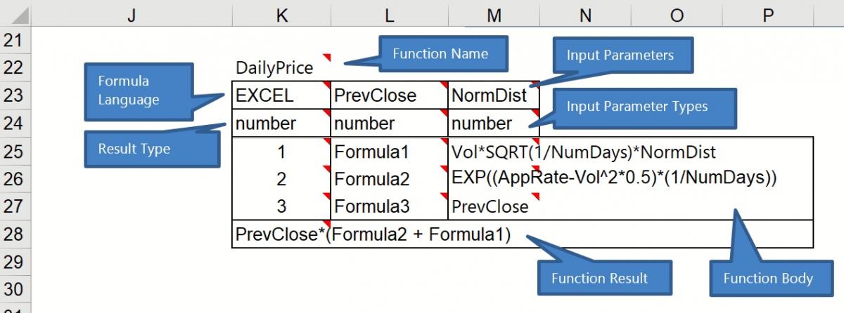 - Function Body – (Cells K25:M27) The third row is the start of the Function body. The body is where intermediary formulas may be calculated. The first column of the body contains an incrementing number 1,2,3. etc., the second column of the body contains the formula name and the third, merged column contains the actual formula. In this example, the 1st formula calculated is Formula1, followed by Formula 2. (Optional)