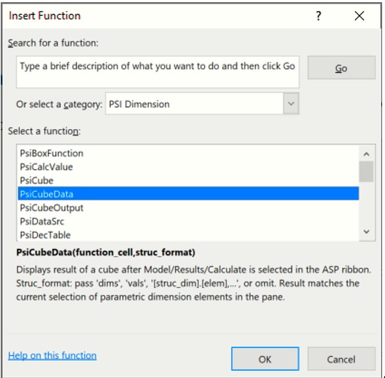 To insert the PsiCubeData() formula, click Formulas – Insert Function on the Excel Ribbon, select Psi Dimension from the Or select a category dropdown menu, select PsiCubeData from the list, then click OK.