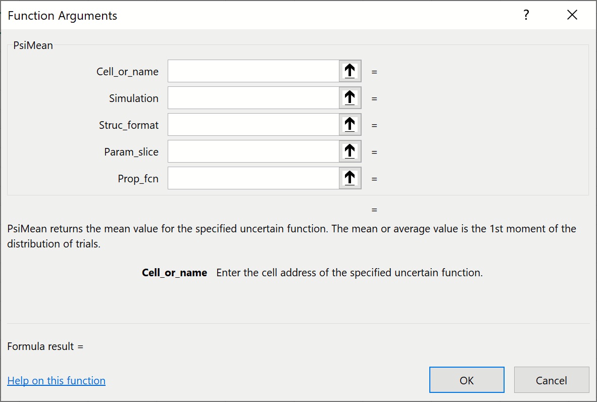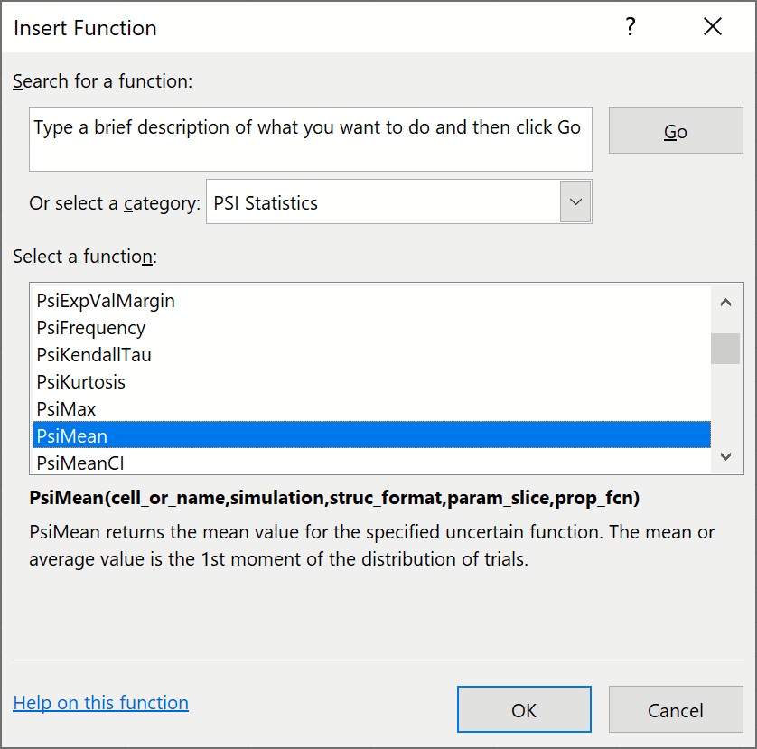 To insert a Psi Statistics function, click Formulas – Insert Function on the Excel Ribbon, select Psi Statistics from the Or select a category dropdown menu, select the desired function from the list.  In this example, we’ll use PsiMean() -- select PsiMean from the list, then click OK.