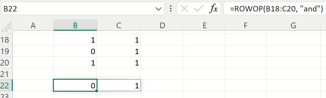 Example 3: Given a matrix containing binary values. The formula =ROWOP(range, “and”) returns 0 in cell B22 to indicate that there is at least one 0 in the corresponding column.