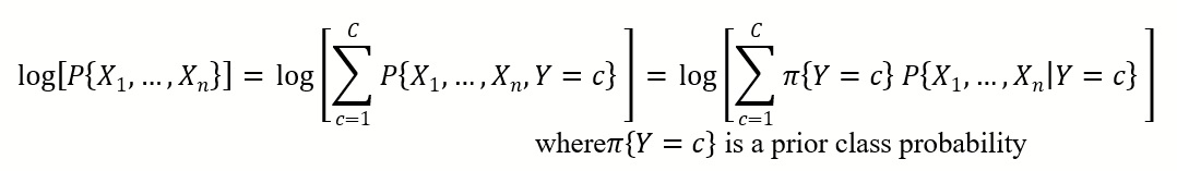 Select this option to print the Log-Density values for each partition in the output. Log PDF, or Logarithm of Unconditional Probability Density, is the distribution of the predictors marginalized over the classes and is computed using: